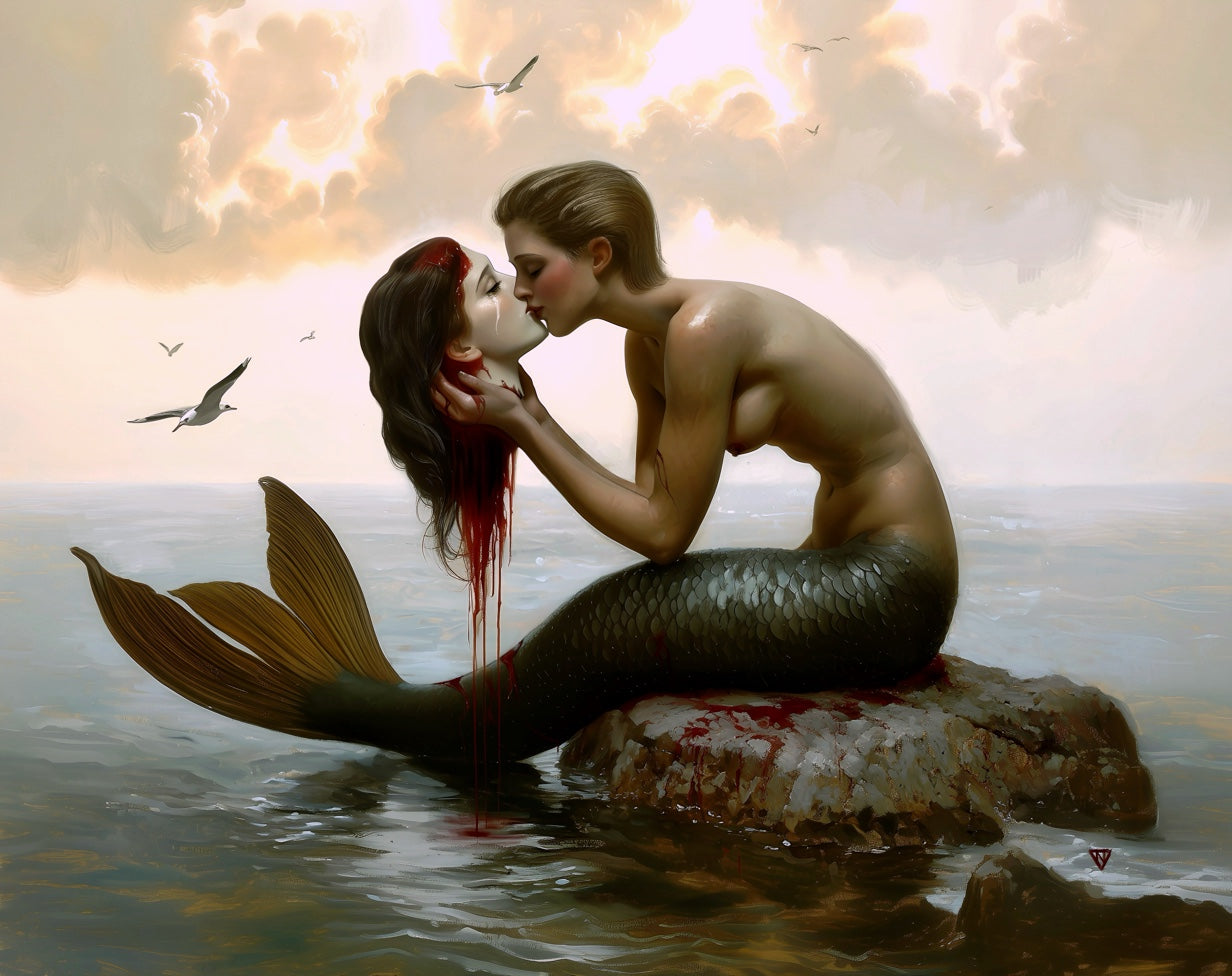 A haunting tribute to devotion, loss, and mythic love. This companion piece to my original best-selling painting “I Love You to Death” reimagines the same tragic romance through a new lens; featuring a mermaid cradling the severed head of her female lover.